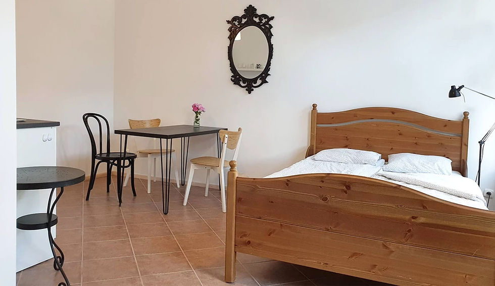 Pokój z łazienką oraz wyposażonym aneksem kuchennym ( płyta indukcyjna dwupalnikowa, lodówka, zlewozmywak, mikrofala, komplet naczyń ). Łóżko podwójne szer. 160cm, telewizor, bezpłatne WI-FI.
